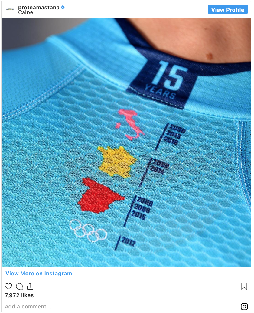 The team will pay homage on their jerseys to Astana’s 15-year anniversary racing in the WorldTour. The new design, featuring the same team colors and design fans are accustomed to, includes the team’s most important wins on the back collar, beginning with General Manager’s Alexandr Vinokurov’s gold medal in the 2012 London Summer Olympic Games to the team’s Grand Tour victories from Alberto Contador’s 2008 win at the Giro up until Fabio Aru’s 2015 victory at the Vuelta a España.