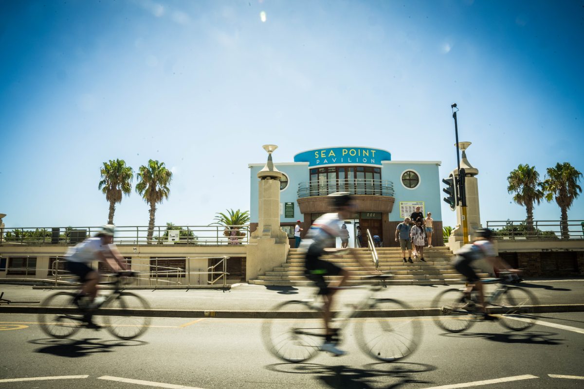 Seapoint Pools’ iconic building: The final image in this sequence is a quiet moment of observation. The iconic building anchors the scene, and riders moving through the city remind us that cycling is as much about community, scenery, and experience as it is about speed. Watching the world go by through this lens is a joy in itself.