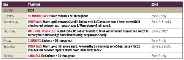 A note from Dr Swart: If you do a race on the Sunday, then take the Monday off and then do a 90min ride in zone 2 on the Tuesday. Then carry on as planned from there.
