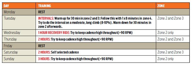 A note from Dr Swart: If you do a race on the Sunday, then take the Monday off and then do a 90min ride in zone 2 on the Tuesday. Then carry on as planned from there.